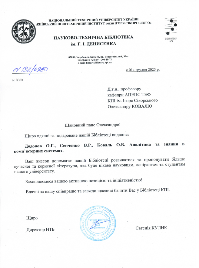 Науково-технічна бібліотека ім. Г. І. Денисенка висловила щиру подяку доктору технічних наук, професору та завідуючому кафедри ІПЗЕ НН ІАТЕ КПІ ім. Ігоря Сікорського Олександру Васильовичу Ковалю за передане до фонду бібліотеки видання «Аналітика та знання в комп’ютерних системах», яке професор створив у співавторстві з професором Г. О. Додоновим та старшим науковим співробітником В. Р. Сенченко